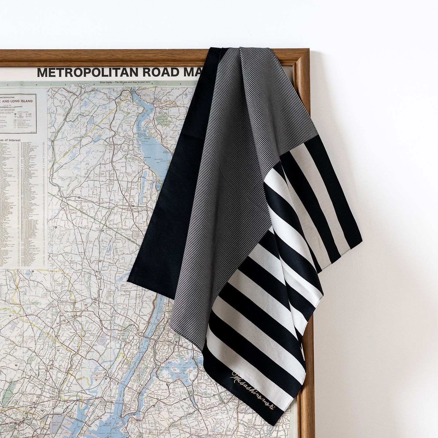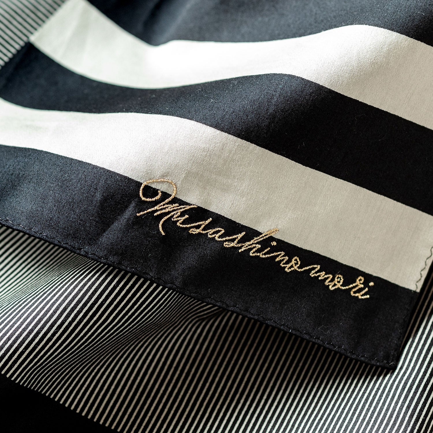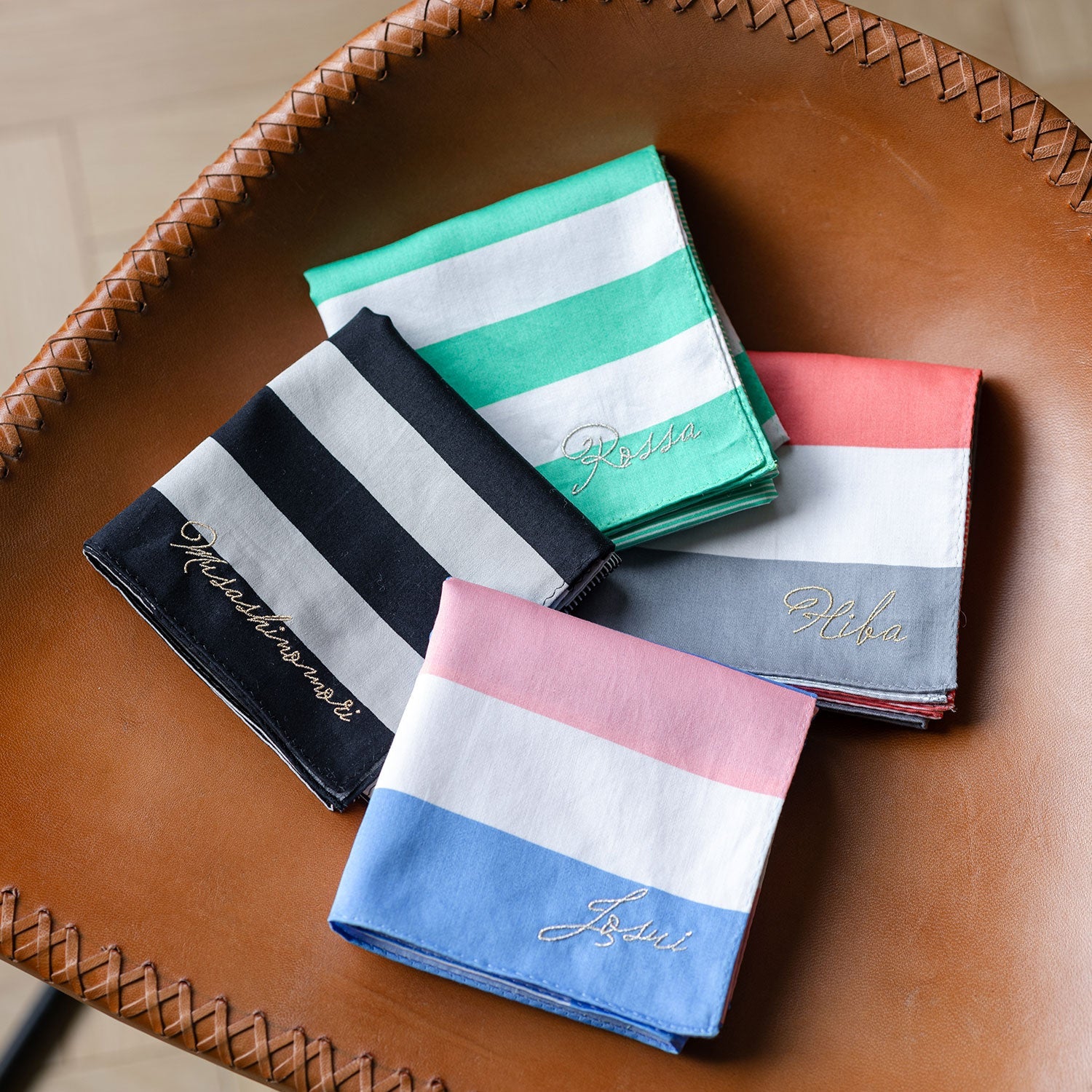 チームのユニフォームカラーをイメージしたバイボーダー柄は、ボーダーのピッチが一枚のハンカチの中で変化し、畳む場所で見え方が変わる楽しみがあります。